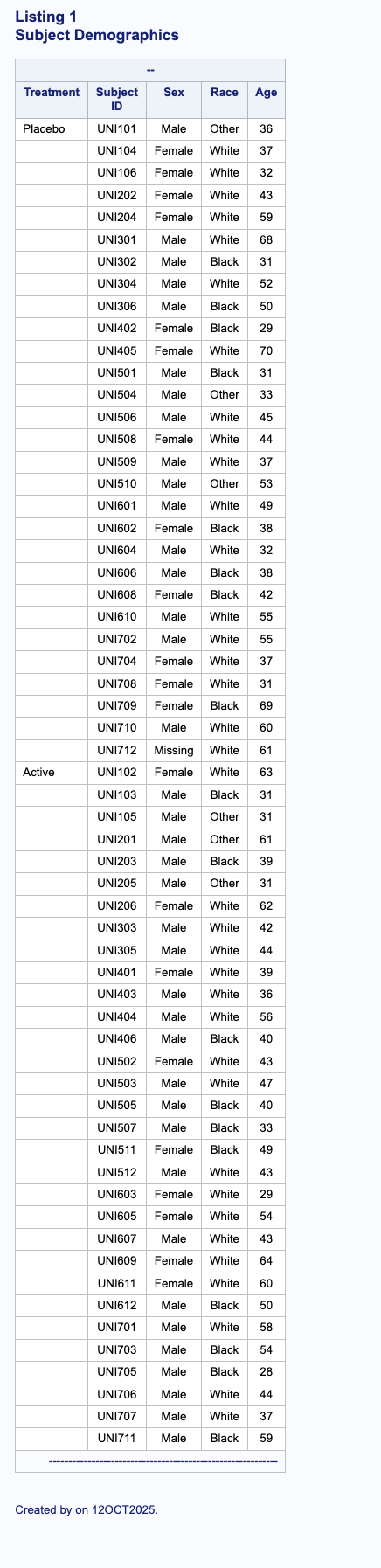 Listing 2: Subjects Demographics