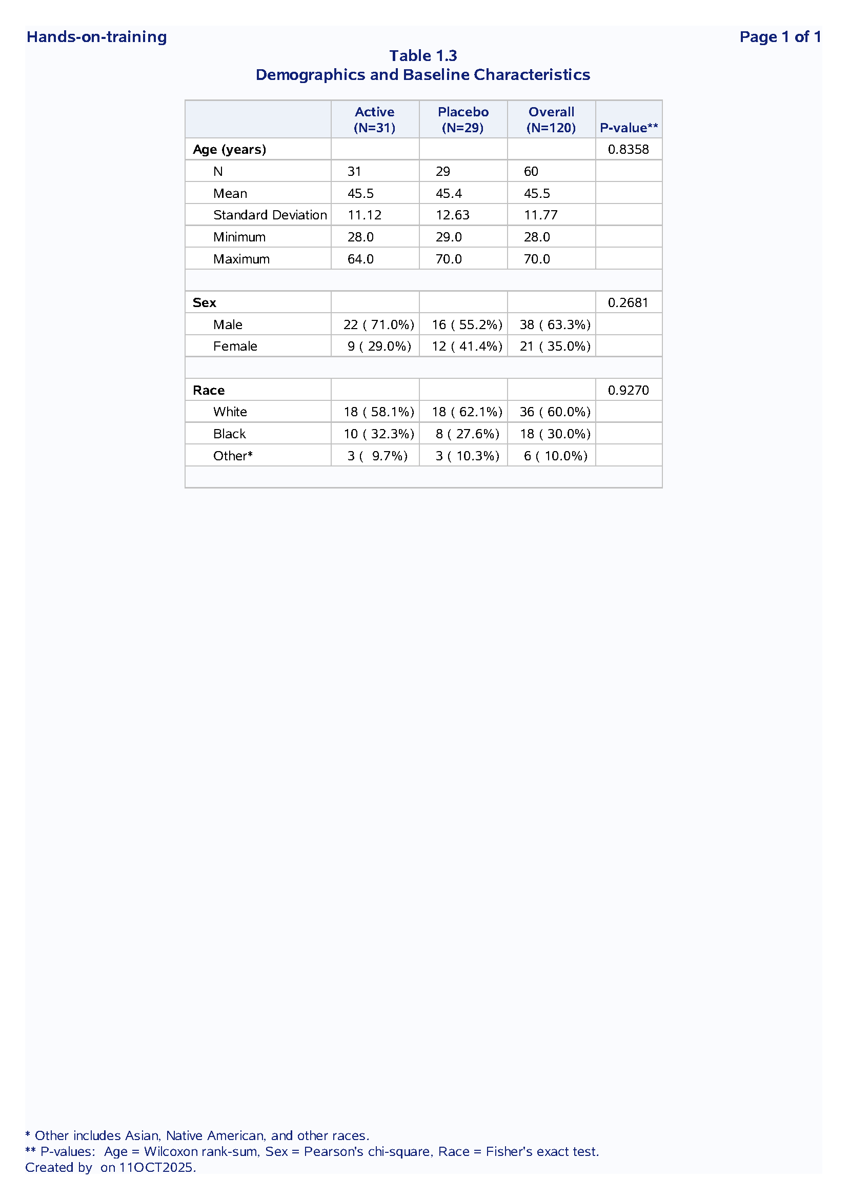 PROC COMPAREfor production vs QC outputsSpecifications: All outputs validated against Statistical Analysis Plan