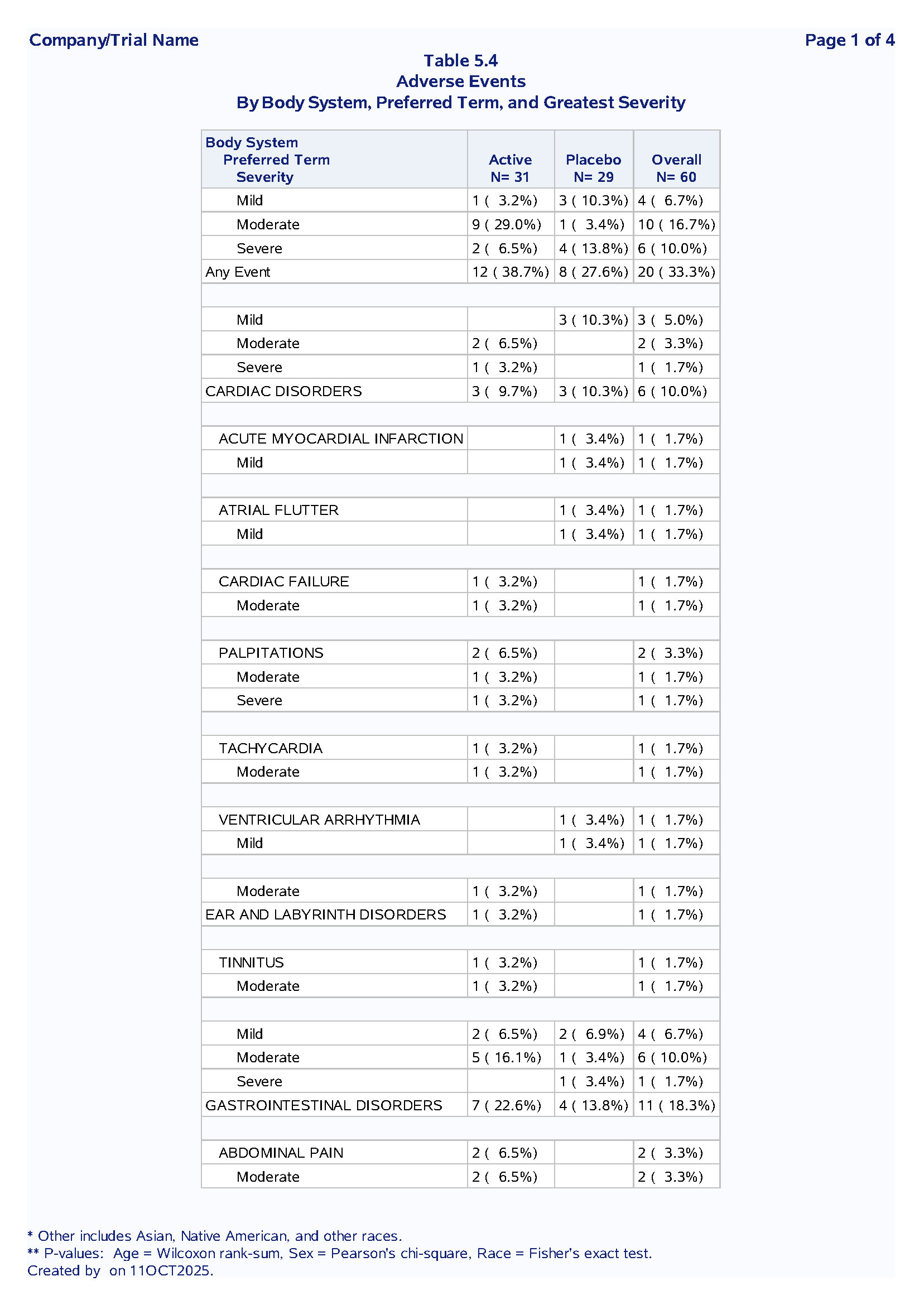 1 Adverse Events Table with nested SOC/PT structure