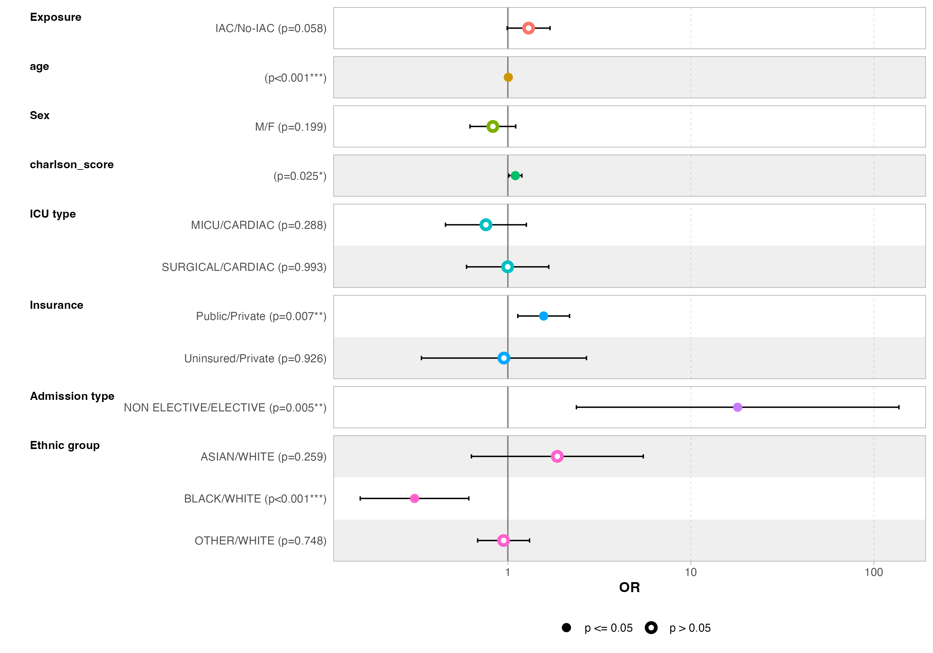 Before any adjustment, baseline characteristics differed between the IAC-exposed and unexposed groups (Table 1), with standardized mean differences (SMDs) ≥ 0.10 observed for several variables, including ICU type, insurance status, and admission type (Figure 2). Specifically, the distribution of ICU types, insurance categories, and admission types differed between exposure groups.