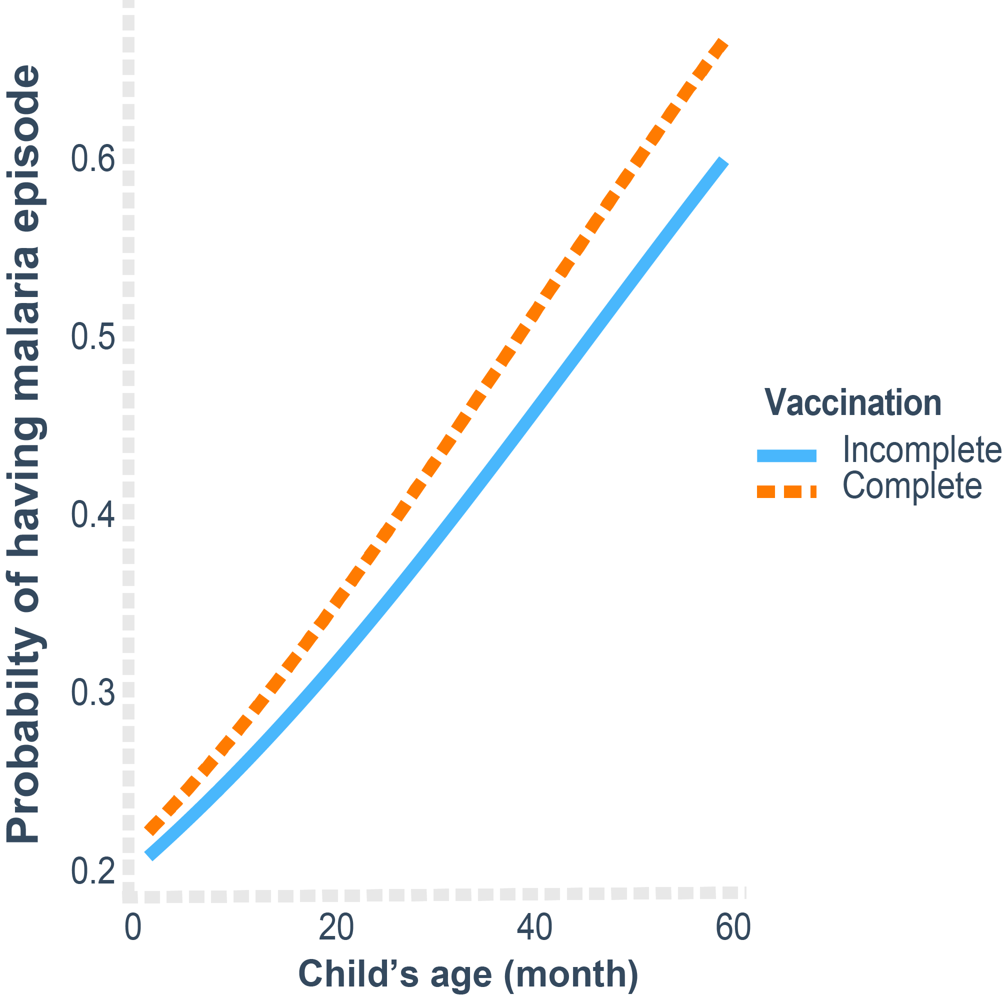 - Covariates: age (+ age²), sex, malnutrition status, HIV status, vaccination completeness (BCG, pentavalent, pneumococcal, polio, rotavirus), prior malaria episode, month of visit (seasonality), distance to facility, district.