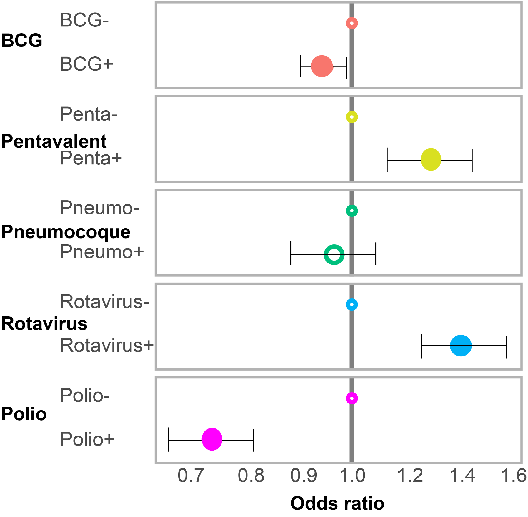 - Age × BCG / pentavalent / pneumococcal / polio / rotavirus vaccination
