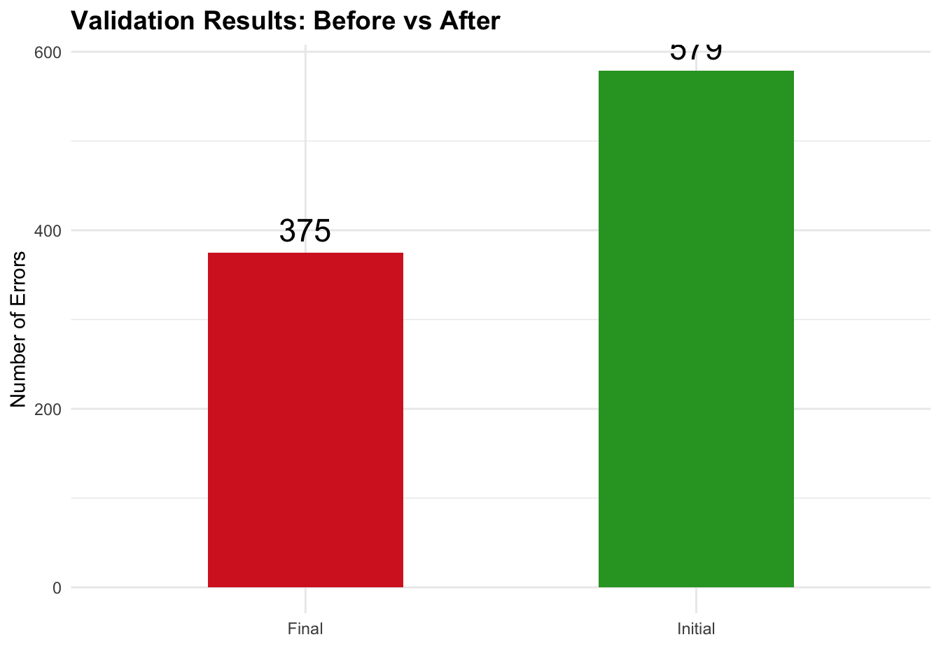 Remaining errors are attributable to source data limitations and newly created domains - both realistic scenarios addressed through stakeholder collaboration in production environments.